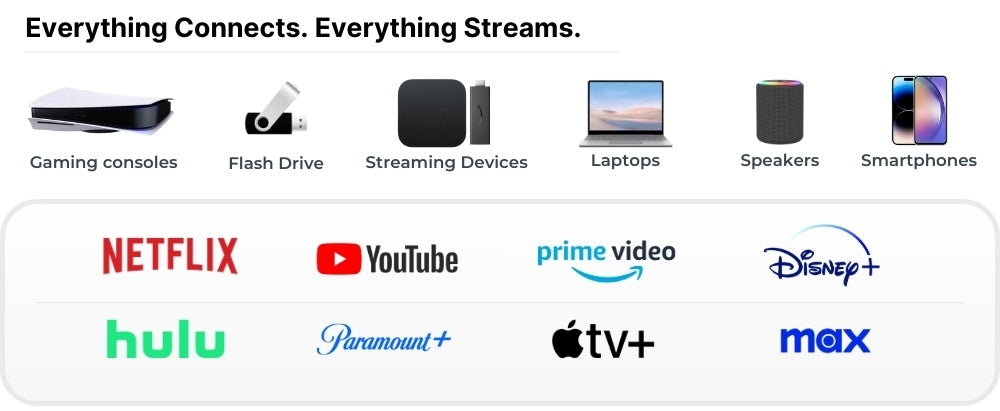 Stream directly from Netflix, YouTube, and more—no need for Fire Stick or consoles.